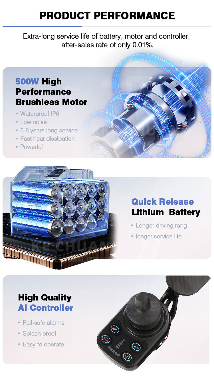 CE approved. Dual motors 250w each 500W in total gives you enough power to conquer your dreams. Magnetic ABES brakes for enhanced safety and lock the wheelchair to go up or down on inclines without your permission.